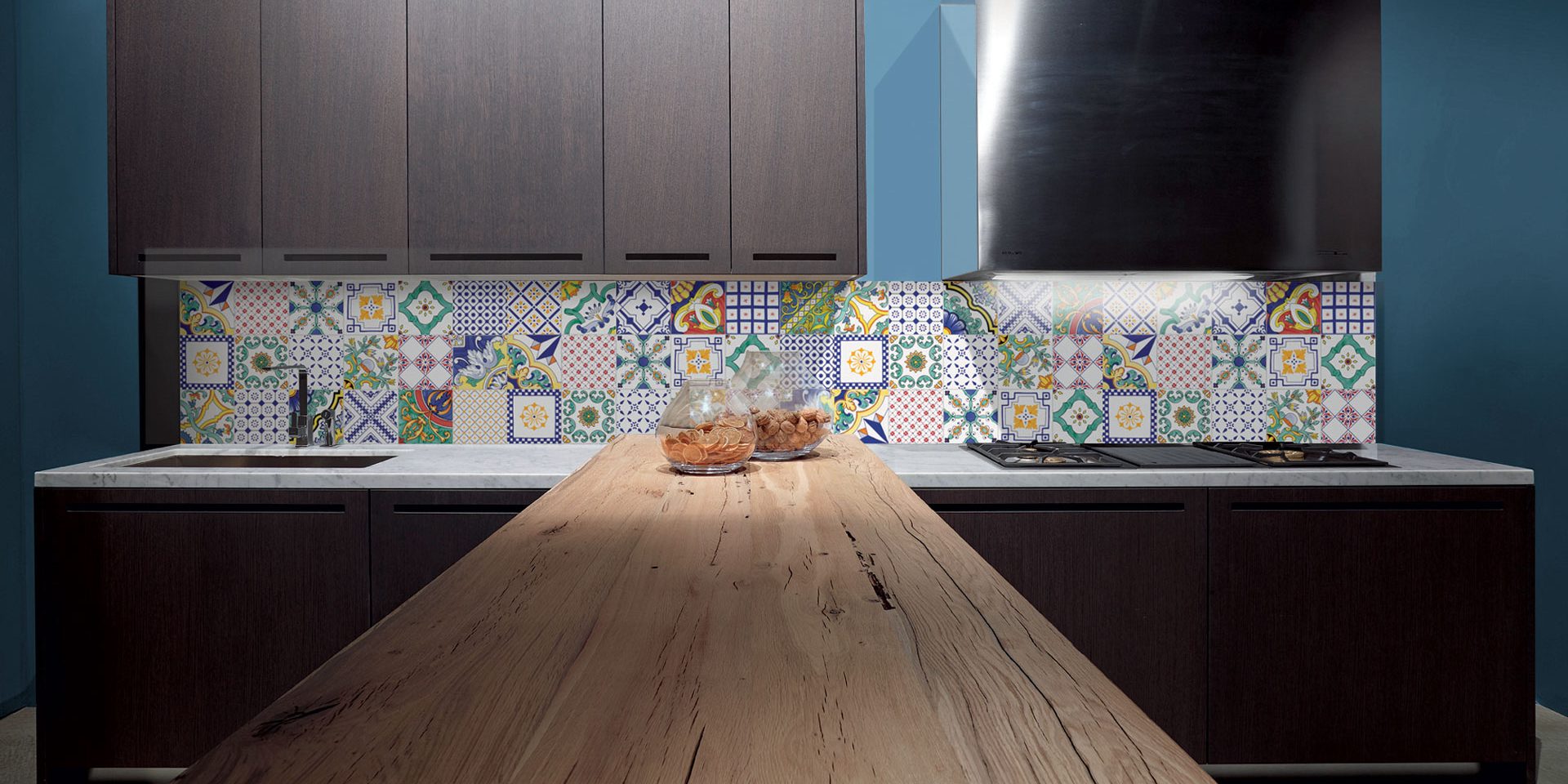 GiovanniDe Maio riprende una tipica tradizione vietrese del dopoguerra ,che prevedeva l’uso delle disponibilità di magazzino miscelandole in modo casuale,richiamando l’arte del patchwork.